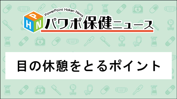 小学校用、中学・高校用のパワポ保健ニュースの体験版です。目の健康のために休憩をとるポイントについて、毛様体の働きなどと併せて6枚のスライドで解説しています。